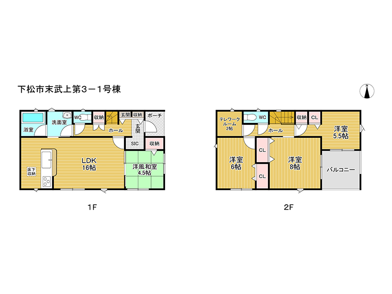 和室4.5畳 1階 1室 洋室5.5畳 2階 1室 洋室6畳 2階 1室 洋室8畳 2階 1室 LDK16畳 1階 1室 +テレワークルーム |