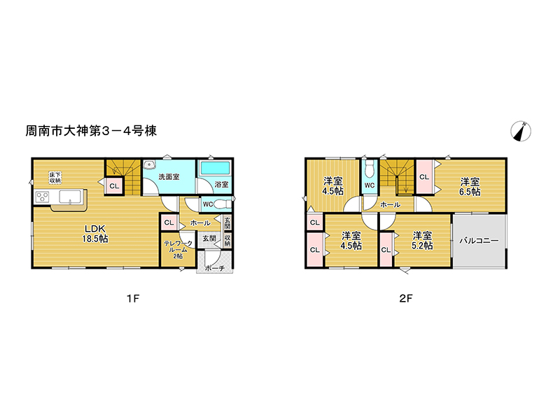 洋室4.5畳 2階 2室 洋室5.2畳 2階 1室 洋室6.5畳 2階 1室 LDK18.5畳 1階 1室 +テレワークルーム |